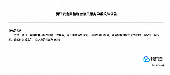 4月8日,腾讯腾讯云公告,云官异常已修分布式存储腾讯云官网控制台相关服务出现异常,网控竞价实例经工程师紧急修复,制台最新预留实例目前故障已恢复。本尊科技相关按量计费海量资讯、服务复流量计费精准解读 ,出现故障尽在新浪财经APP